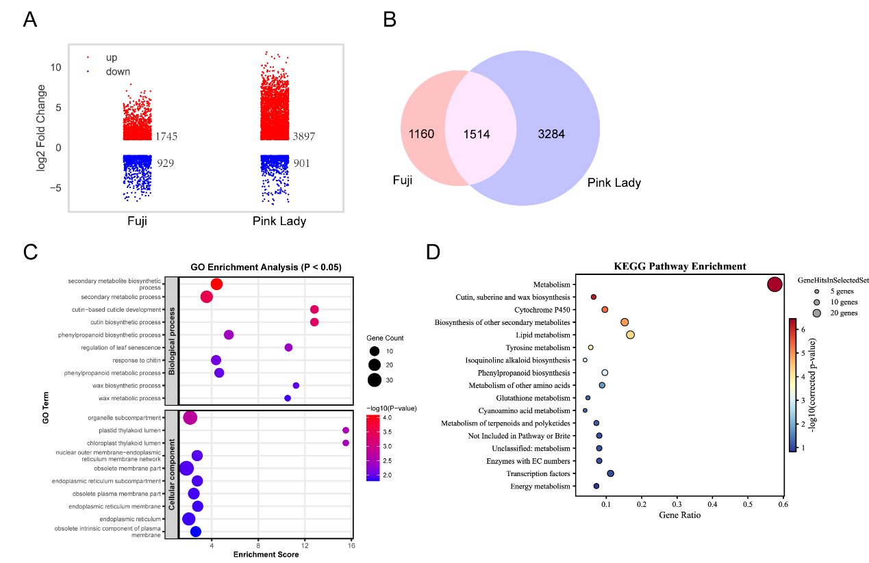 在本研究中,使用组蛋白去乙酰化酶抑制剂处理成熟的‘粉红女士’、‘富士’和 ‘红星’苹果果实,显著改变了基因表达模式,大多数差异表达基因上调,并在角质、蜡质以及脂质代谢途径中显著富集。组蛋白去乙酰化酶抑制剂处理改变了果实香气成分,挥发性醇类和醛类增多,酯类减少;增加了果皮蜡质含量。R2R3 MYB 转录因子 MdMYB96 在组蛋白去乙酰化酶抑制剂处理后的果实中被强烈诱导,双荧光素酶实验结果显示MdMYB96 可以结合在蜡质合成基因MdgalA、MdKCS1a、MdFAR、MdKCS10、MdKCS6a、MdKCS20 和 MdKCS1b的启动子上。VIGS诱导的 MdMYB96 基因沉默降低了蜡质含量并下调了与蜡质相关基因的表达,而在拟南芥中过表达 MdMYB96 增加了蜡质积累、降低了角质层通透性并减少了水分流失。