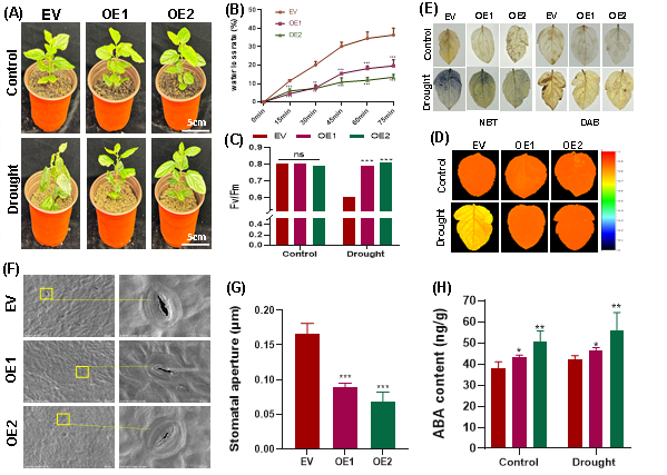 此外,研究人员获得MhNCED3过表达转基因苹果植株,干旱处理发现MhNCED3过表达促进气孔关闭和ABA积累,提高苹果植株的抗旱性(Figure 2 )。