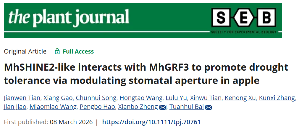 近日,河南农业大学苹果逆境生物学与简约栽培技术团队在国际著名期刊The Plant Journal(中科院一区Top)发表了题为“MhSHINE2-like interacts with MhGRF3 to promote drought tolerance via modulating stomatal aperture in apple”研究论文。课题组前期通过干旱胁迫下的转录组分析,筛选出一个受干旱胁迫诱导表达的转录因子即AP2/ERF转录因子MhSHINE2-like,并发现MhSHINE2-like与MhGRF3蛋白互作调控气孔运动增强苹果的耐旱性。