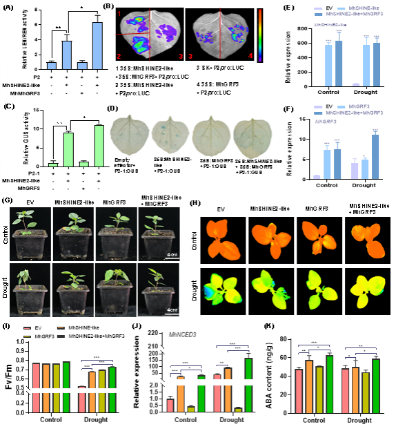 Figure 3.MhSHINE2-like interacts with MhGRF3 and enhances the transcriptional activity of MhNCED3 to confer drought tolerance in apple plants.