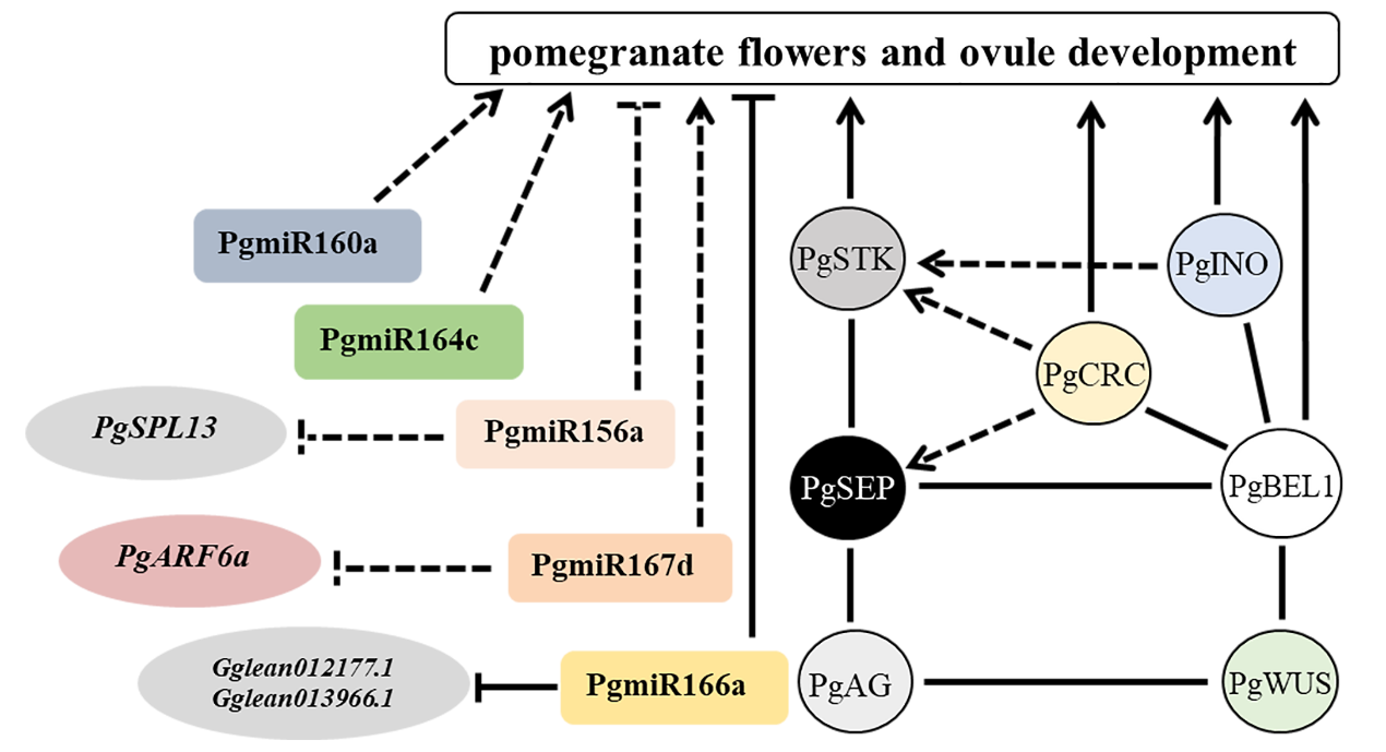 植物种子数量取决于心皮内发育形成的胚珠数目,是决定种子植物产量的主要因素。石榴胚珠为倒生胚珠,具有双层珠被和厚珠心。近年来,研究已逐步明确植物胚珠发育的分子机制。研究表明,石榴PgCRC与PgINO基因正向调控胚珠数目增加,并与PgBEL1协同调控种子发育。过表达PgAGL11转基因拟南芥可以促进胚珠发育。同时,PgBEL1蛋白作为分子桥梁介导PgSEP与PgINO、PgCRC、PgSTK和PgAG间相互作用,进而调控胚珠发育。此外,microRNA负调控靶基因参与控制植物发育过程。在转录调控水平上,PgmiRNA167、PgmiRNA164和PgmiRNA160在石榴花发育过程中呈现差异表达,PgmiR166a通过负调控其靶基因参与胚珠发育。