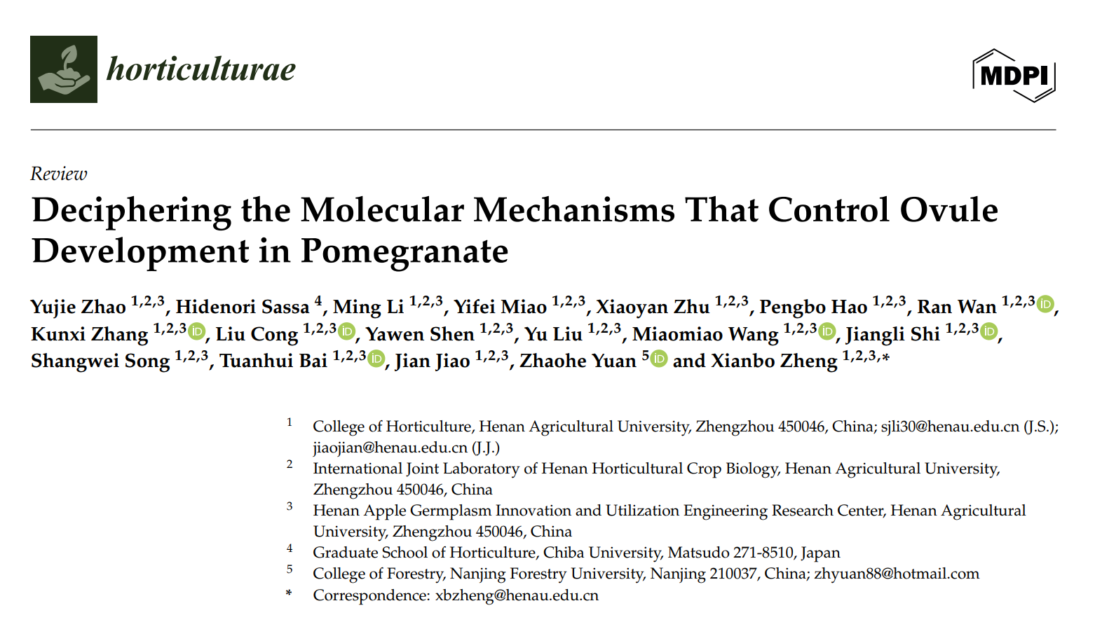 近日,河南农业大学园艺学院苹果逆境生物学与简约技术栽培体系团队在国际知名学术期刊Horticulturae(中科院二区,影响因子3.2)上发表了题为"Deciphering the Molecular Mechanisms That Control Ovule Development in Pomegranate"的综述文章。