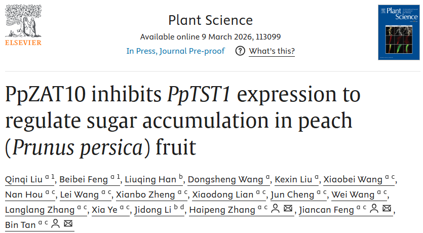近日,河南农业大学园艺学院桃生物学与种质创新团队在Plant Science杂志在线发表了题为“PpZAT10 inhibits PpTST1 expression to regulate sugar accumulation in peach (Prunus persica) fruit”的研究成果,在桃果实可溶性糖积累机理研究方面取得新进展。