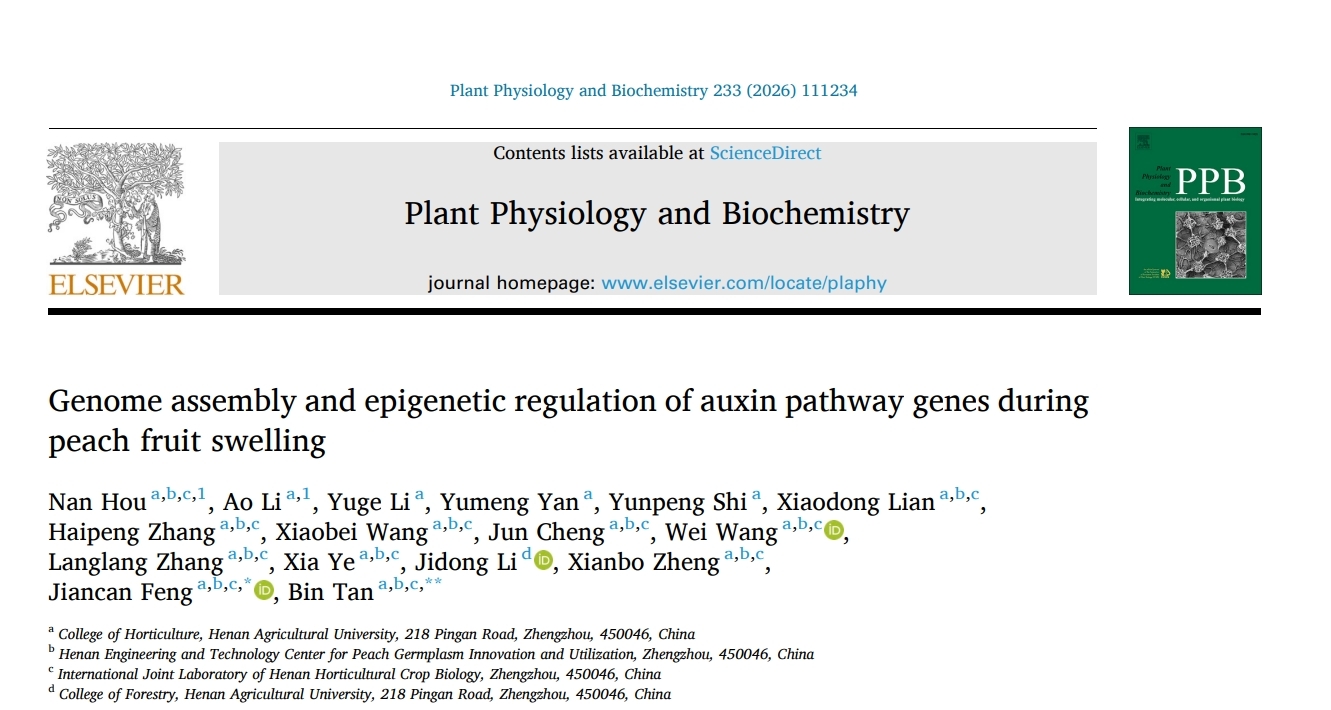 近日,河南农业大学园艺学院桃生物学与种质创新团队在Plant Physiology and Biochemistry杂志在线发表了题为“Genome assembly and epigenetic regulation of auxin pathway genes during peach fruit swelling”的研究论文,揭示了DNA甲基化通过调控生长素代谢基因参与果实膨大的表观遗传机制,为培育高产优质桃新品种奠定了理论基础。