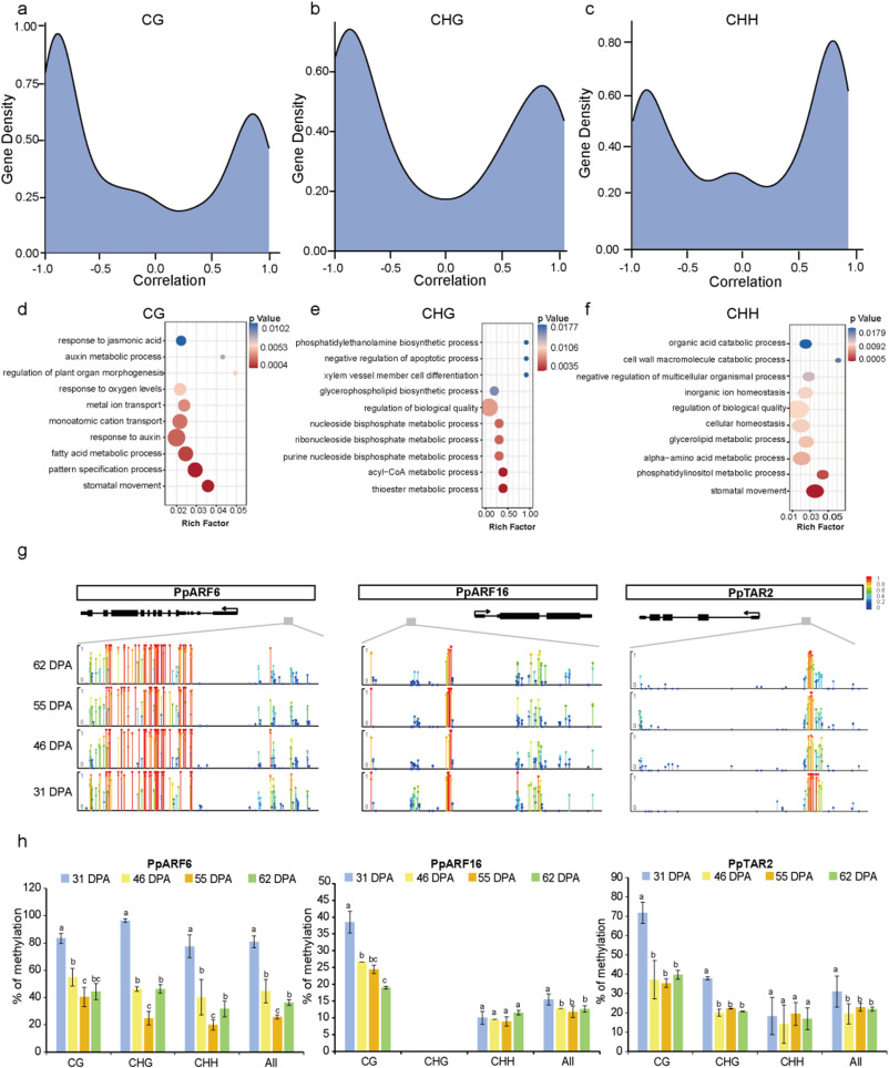 DNA甲基化是一种保守的表观遗传修饰,在基因调控和基因组稳定性中发挥着关键作用。近年来,越来越多的研究探讨了DNA甲基化在果实发育中的作用。然而,DNA甲基化是否参与调控桃果实膨大尚不明确。本研究完成了‘中油4号’桃的单倍体基因组组装,并系统分析了其四个果实发育阶段的甲基化组与转录组变化。结果显示,与花后31天相比,CG和CHG位点的甲基化水平在花后46、55及62天显著降低,而CHH甲基化水平则呈上升趋势。进一步研究发现,CG和CHG甲基化变化可能与DNA去甲基化酶相关,而CHH甲基化则受DNA甲基转移酶调控。通过联合分析,研究鉴定出三个生长素相关基因——PpARF6、PpARF16和PpTAR2,其CG甲基化水平与基因表达呈负相关,并在5-氮杂胞苷处理的‘枣油桃’愈伤组织中得到验证(图1)。